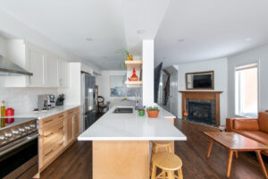 This family-friendly kitchen and living space is a finalist in the GOHBA Housing Design Award category Renovation under $150,000.With bold & stylish design choices, these homeowners combined their kitchen and dining space, while also making cohesive updates to the living room and entryway.