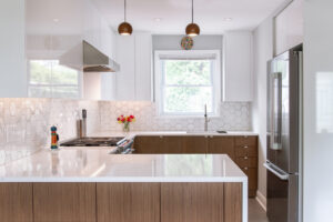 This beautiful renovation is a finalist in the GOHBA Housing Design Award category Custom Kitchen (175 sf or less) – Contemporary.This ensuite renovation creatively addressed the challenge of limited natural light, while updating the aesthetic to create a feeling of opulence.