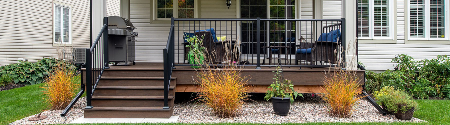 A ceiling fan enhances airflow on warm days, and the overhead cover makes outdoor cooking and lounging comfortable, rain or shine. With a natural connection to the garden and thoughtful material choices, this deck delivers lasting comfort, functionality, and timeless appeal.