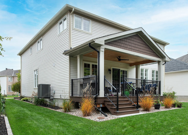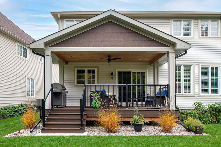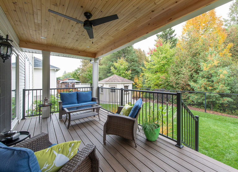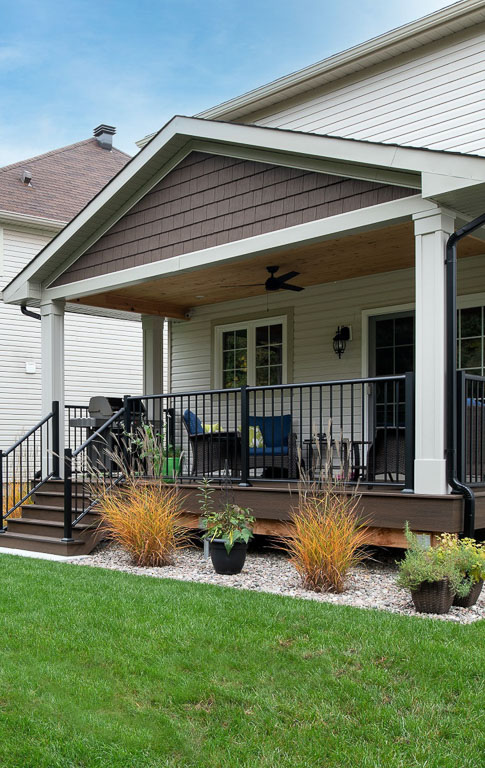 We designed this covered backyard deck to create an inviting outdoor space that’s both sheltered and stylish. With composite decking, a ceiling fan for airflow, and protection from the elements, it’s the perfect spot to relax, entertain, and enjoy the outdoors with ease.
