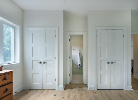 We brought warmth and cohesion to the interior through an open-concept layout, natural French-cut oak flooring, and a calm palette of soft whites. The kitchen, designed for connection, features dual sinks, a double oven, and an oversized refrigerator, perfect for family cooking and entertaining. Built-in storage, a custom mudroom bench, and a second-floor laundry room ensure daily life runs effortlessly. In the primary suite, expansive windows showcase the tree’s canopy, while a spa-inspired ensuite offers a moment of calm. Together, these choices created a home that feels bright, balanced, and deeply tied to its surroundings