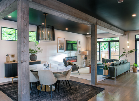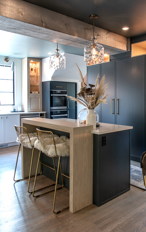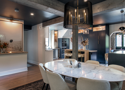 Design choices emphasize both elegance and cohesion. Barnboard-clad beams subtly define the open space, while shaker cabinetry in Starry Night, Satin White, and birch tones pairs with dual quartz countertops in contrasting light and dark. Black and gold fixtures add sophistication, complemented by birch shelving, glass displays, and panel-ready appliances. Natural light, LED pot lights, and newly blended hardwood unify the home’s character with modern functionality. The result is an expansive kitchen renovation that feels both dramatic and inviting, perfectly suited for gathering, cooking, and creating memories.