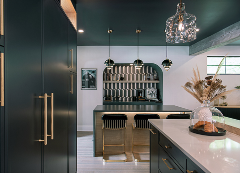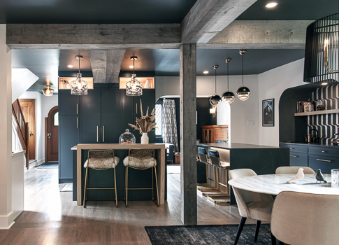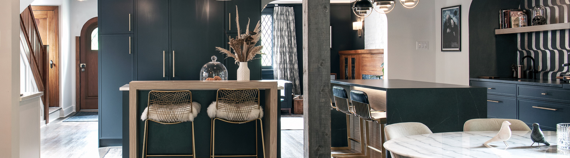 We reimagined this home with an expansive kitchen renovation, spanning the full width of the house. Designed for connection and entertaining, the space features dual islands, hidden storage, and custom finishes that balance everyday function with dramatic style.