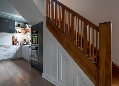 We set out to create a kitchen that supports both family life and entertaining. The oversized layout spans the home’s width, anchored by two distinct islands, one tailored for coffee and cocktails, the other for food preparation. Seating at both islands maximizes interaction, while a formal dining space maintains balance within the open plan. Every detail was carefully considered, from a built-in pantry beside the refrigerator to hidden storage beneath the stairs, ensuring no corner was wasted.