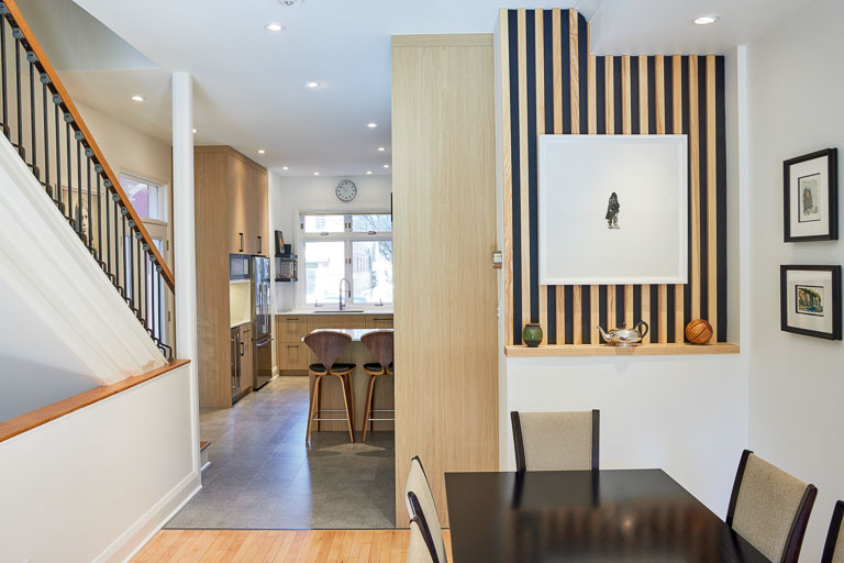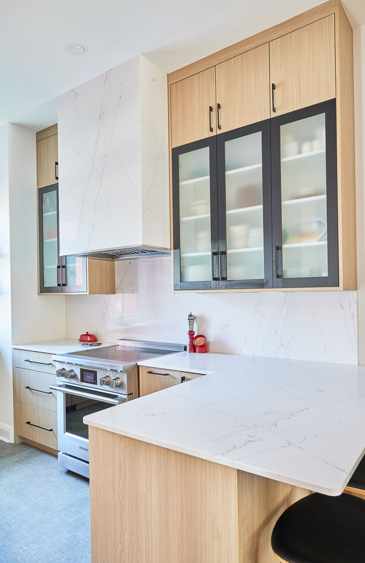 Cohesion comes through in the striking material palette. Natural maple and matte black cabinetry with frosted glass paired with quartz surfaces that extend seamlessly across the counters, backsplash, and hood fan. A dining room accent wall, finished in dark paint with light maple slats, ties the spaces together with warmth and texture. Durable LVT flooring, under-cabinet lighting, and tailored storage solutions enhance everyday function, while the refined finishes elevate the aesthetic. The result is a renovation that is practical and sophisticated, creating a home that feels bold, modern, and beautifully cohesive.