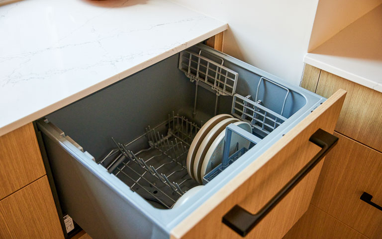 We approached this main floor renovation with the goal of improving flow and usability while introducing bold, modern style. The kitchen was reorganized with the sink positioned to overlook a window, the fridge aligned with cabinetry, and additional counter space created. A custom beverage station near the fridge supports entertaining, while the entryway gained a bench with hidden storage and a wardrobe lift for off-season items. We improved the flow in the living room by relocating a structural post and replacing the traditional doors with a double slider patio door that brings in abundant natural light.