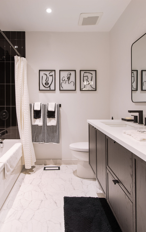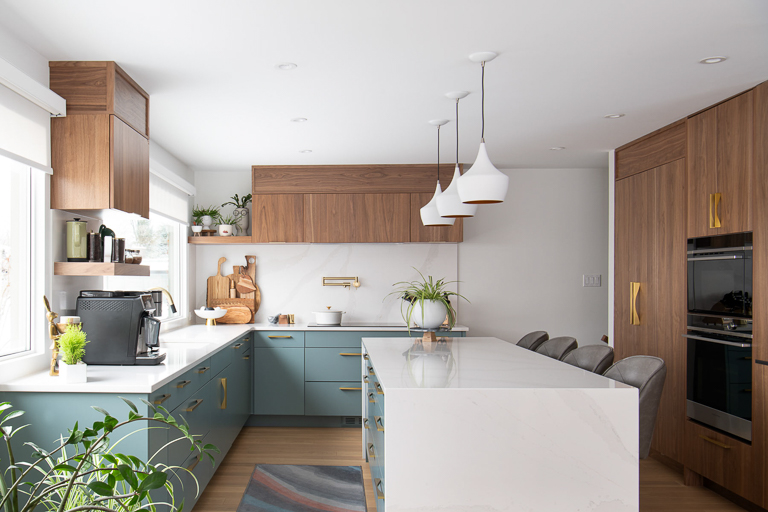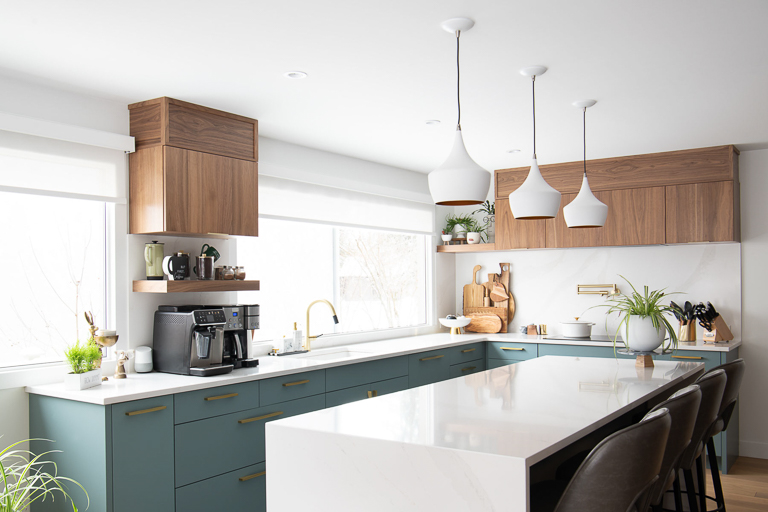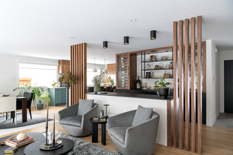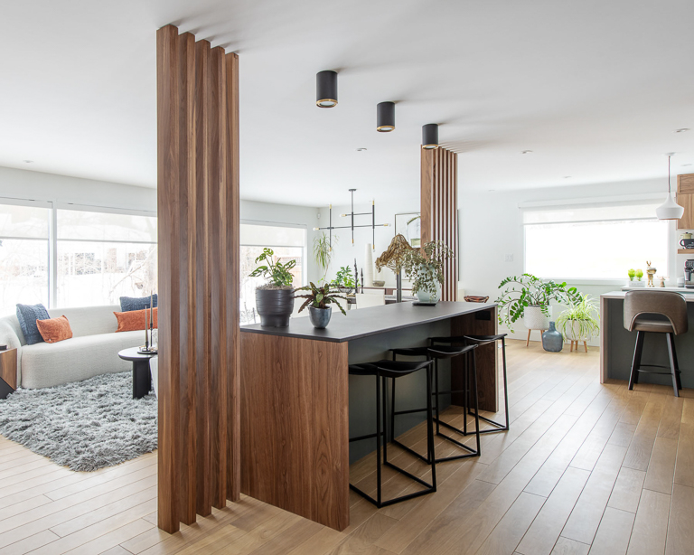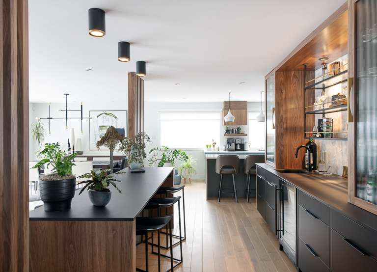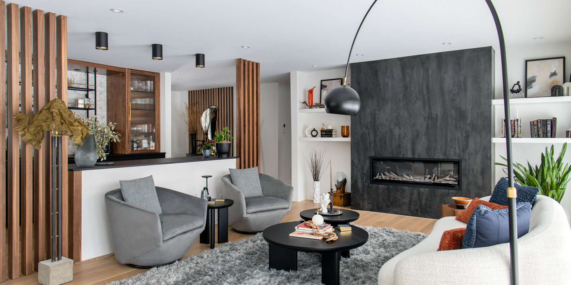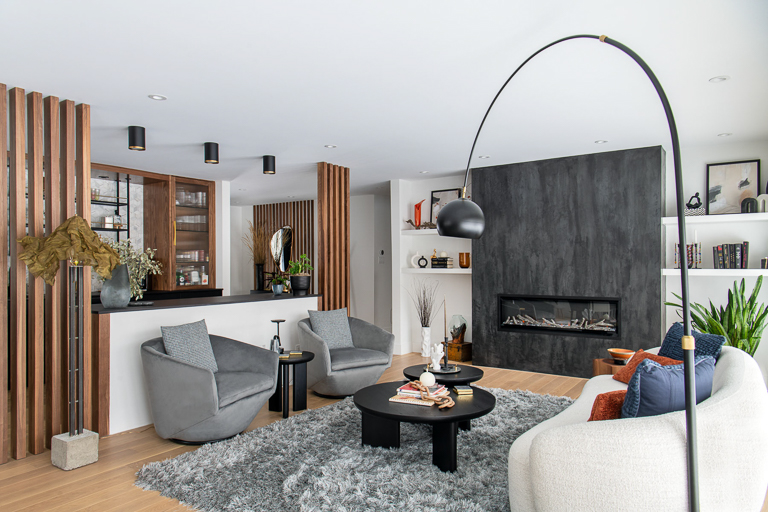 To elevate both style and function, we emphasized modern elegance through a palette of deep greys, soft whites, and warm wood tones, complemented by black detailing and wood slat accents that subtly define the open areas. Bulkheads conceal the hood fan, while Venetian plaster adds a suede-like finish to the fireplace, creating a unique focal point. By unifying ceiling heights and layering materials and textures, we established a cohesive look that reflects the homeowners’ love of modern design while ensuring comfort, style, and longevity.