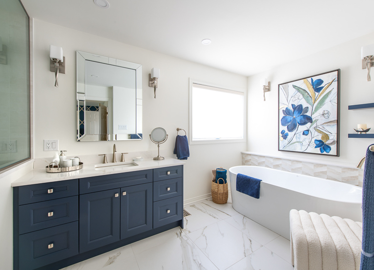 The bathroom was reimagined as a brighter, more open retreat by replacing full walls with half walls and glass, creating a layout that feels spacious and inviting. A boxed-in tub gave way to a freestanding design paired with a tiled feature wall and floor-mounted faucet, forming a striking focal point. The relocation of the shower fixtures allowed for a larger footprint, while niches and a full linen closet provide tailored storage. A refined palette of neutrals, brushed nickel fixtures, floating shelves, and quartz ledges presents both elegance and practicality. Every element—from hexagon floor tiles selected for safety to the carefully coordinated finishes—works together to create a cohesive, spa-inspired space that blends function with luxury.