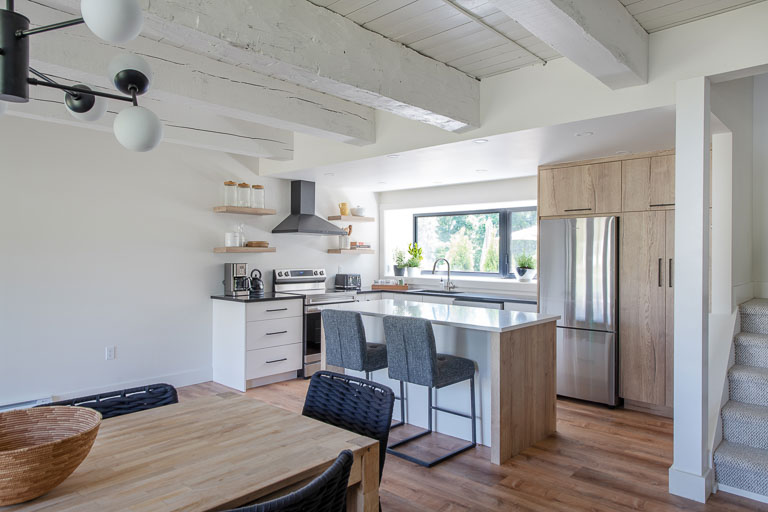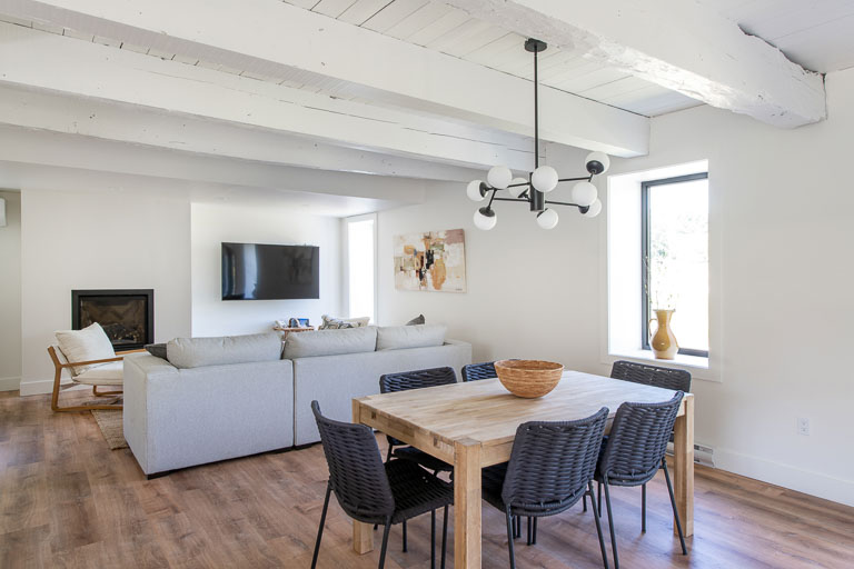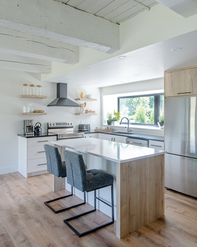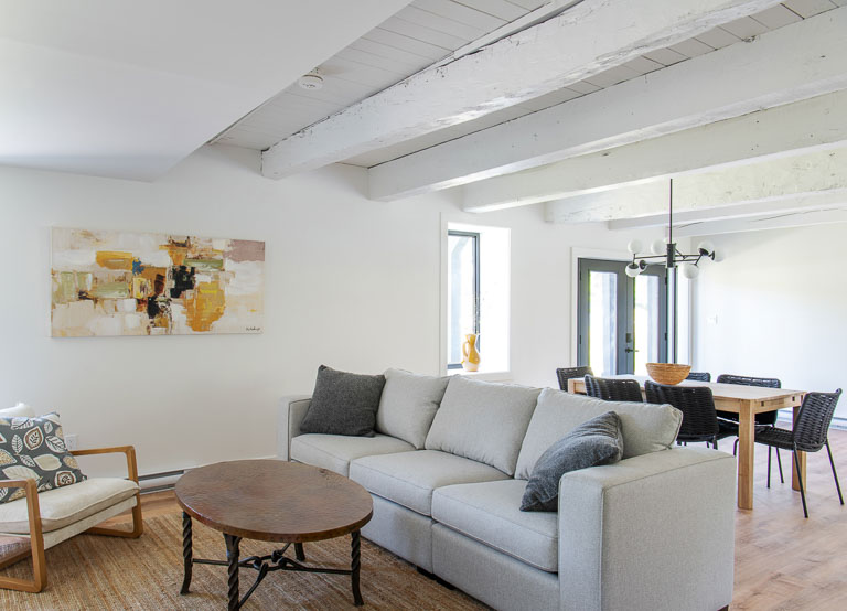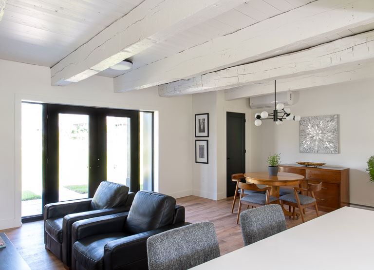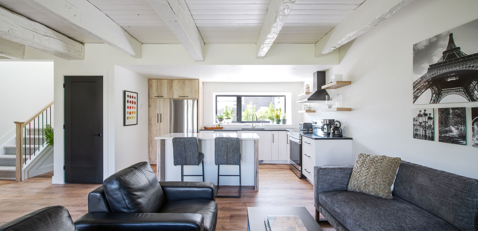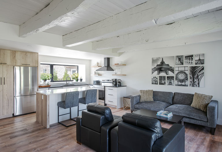 Inside, we designed mirrored layouts featuring two bedrooms, two bathrooms, and chef-inspired kitchens with large islands and open living spaces. Warm creams, cozy greys, and pops of black evoke Parisian flair, while durable finishes ensure low maintenance and longevity. Maintaining the original, white-painted beams and rustic wood accents ties the modern design back to its historic roots. Working within 24-inch-thick stone walls, we carefully levelled floors, reinforced the structure, and collaborated closely with the township to bring this rare income property to life—a one-of-a-kind project that seamlessly blends heritage charm with contemporary function.