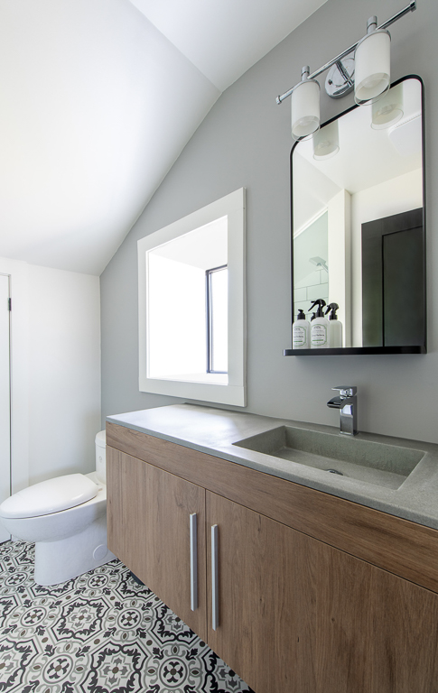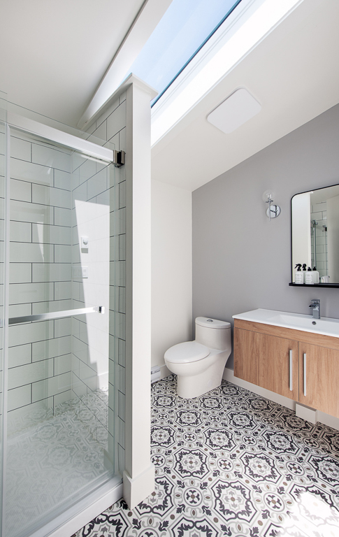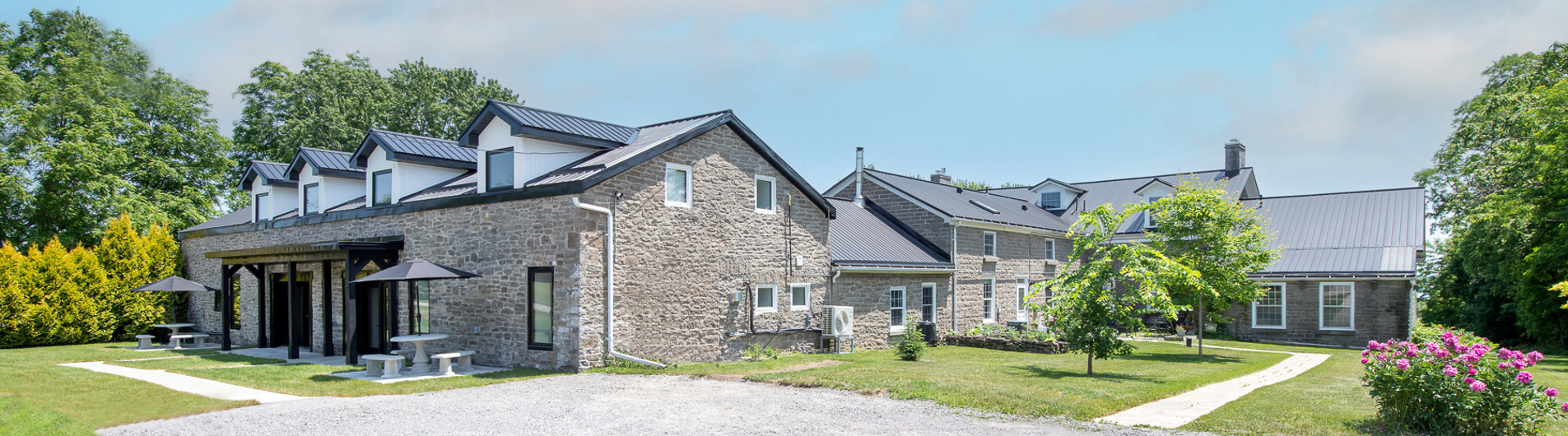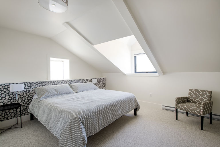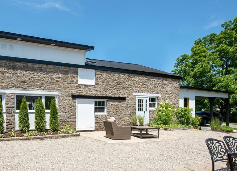 We reimagined the original carriage house as two self-contained apartments that respect its 19th-century origins while embracing modern design. To create livable second-storey suites, we added four dormers and a rear roof extension, introducing height, light, and warmth without compromising the structure’s integrity. Black-framed windows, French doors, and a steel roof lend a contemporary edge that complements the original grey stone façade. A covered carport with storage and garbage access maximizes function, while each unit enjoys its own front patio and private entry.