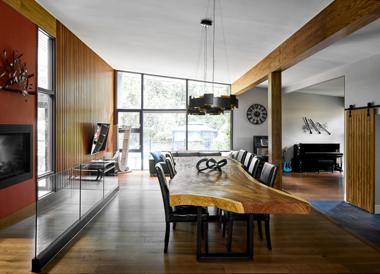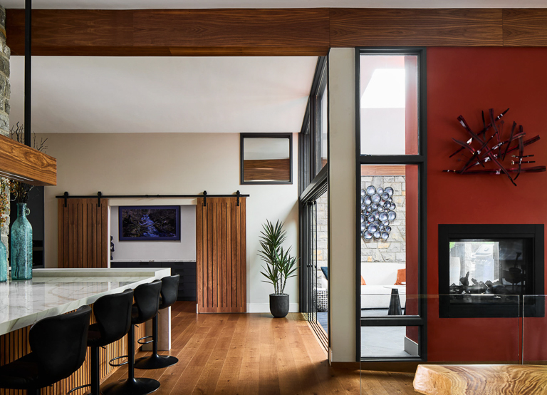 We reimagined the original layout to unify the kitchen, dining, and living zones, creating a barrier-free space that flows effortlessly. Warm walnut slats, matte black accents, and creamy countertops define the interior palette, blending mid-century character with modern minimalism. The bold double-sided red fireplace now anchors the main level, reinterpreted with sculptural presence and a contemporary edge. Sloped ceilings and clerestory windows flood the home with light, while wide-plank oak floors and full-height glazing establish a seamless connection to the wooded landscape beyond.