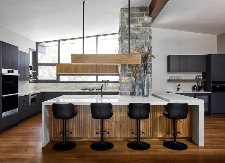 To preserve sightlines and maintain clean lines, we engineered a bespoke downdraft ventilation system concealed below the cooktop, eliminating the need for a visible hood. A multi-functional island integrates a cold shelf, sink, and seating, while hidden storage, wide clearances, and zero-threshold transitions enhance accessibility without compromise. Unified walnut detailing and panel-ready appliances tie every room together, delivering a sophisticated balance of craftsmanship, comfort, and cohesion, all within the home’s original footprint.