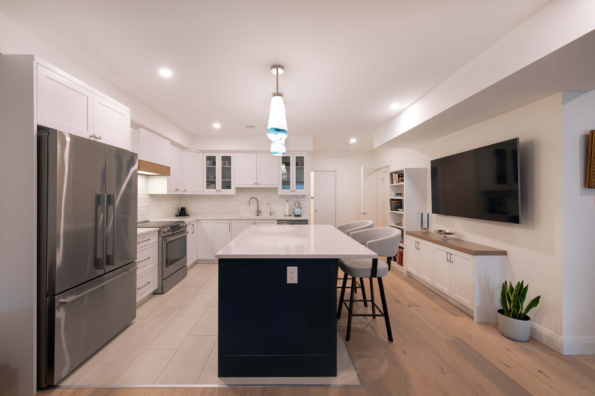 We set out to transform the basement into a fully independent suite, balancing accessibility and livability. A walkout addition beneath the existing deck introduced natural light, while structural excavation, frost walls, and grading ensured seamless integration with the home. Radiant in-floor heating within a new slab eliminated the need for bulky ductwork, paired with luxury vinyl plank flooring for warmth and durability. The layout accommodates a full kitchen, open-plan living and dining area, bathroom, bedroom, laundry, and generous mudroom, every inch carefully planned for function and flow.